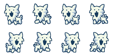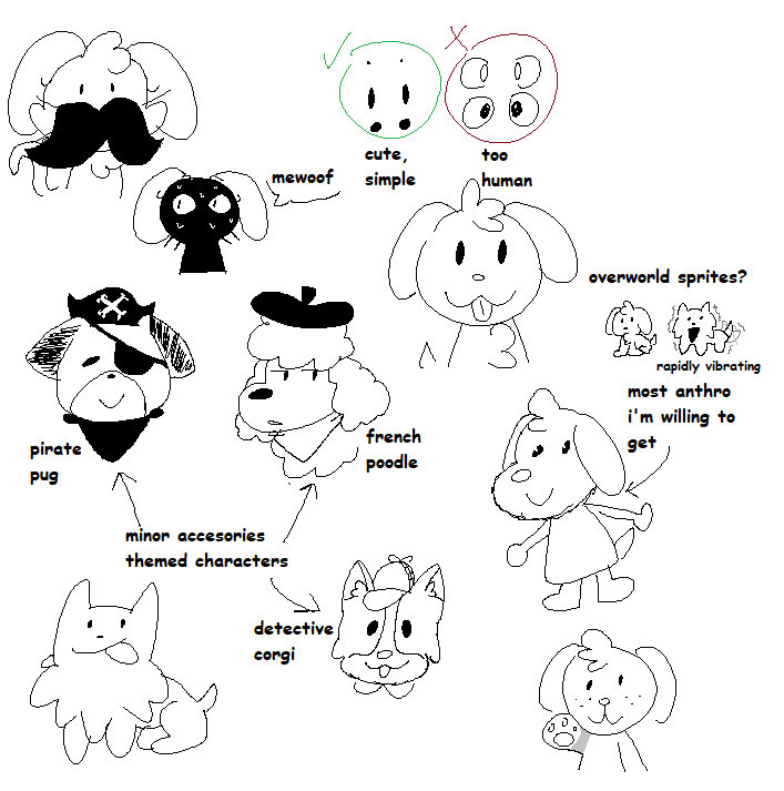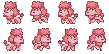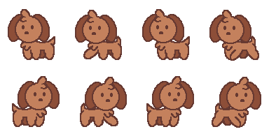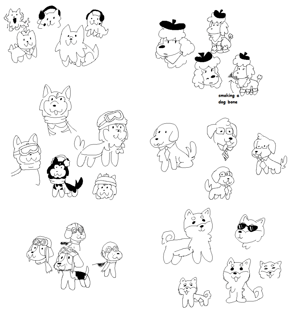 These are all the sprite sheets I designed for the characters in the game. The top dog is meant to look generic and serves as the player character. The rest of the dogs are customers and were inspired by specific breeds.