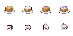 These were some variations of the main items players would serve: cake and coffee. The cake comes in either plain, frosted, jam, or frosted and jam, while the coffee comes in plain, sugar, cream, or sugar and cream.